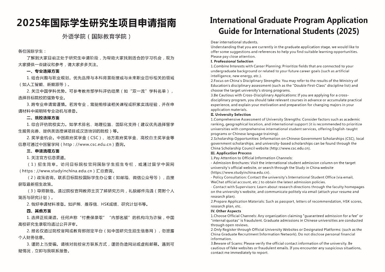 《指南》从专业选择、院校评估、申请流程等多个方面为国际员工提供了详细的建议。在专业选择方面,建议员工结合自身兴趣与职业规划,优先选择与本科背景衔接或与未来职业目标相关的领域,并关注中国学科的优势专业。在院校选择方面,指南建议员工综合考虑院校的学术排名、地理位置及国际化支持,同时关注各类奖学金机会。此外,指南还详细列出了申请流程中的关键步骤,包括如何获取官方招生信息、准备申请材料以及如何与导师沟通等,并特别提醒员工通过正规渠道申请,谨防诈骗。