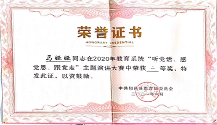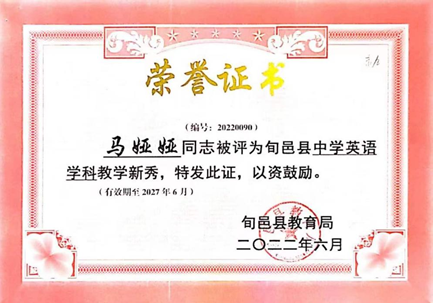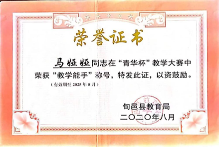 为加快推进我省新时代基础教育“三级三类”骨干教师建设,落实立德树人根本任务,2022年5月在旬邑县教育局开展的教学能手选拔活动中,公司beats365唯一官方网站2018届优秀毕业生马娅娅凭借扎实的教学基本功获得“旬邑县教学能手”荣誉称号,这是她第二次获得“教学能手”称号。